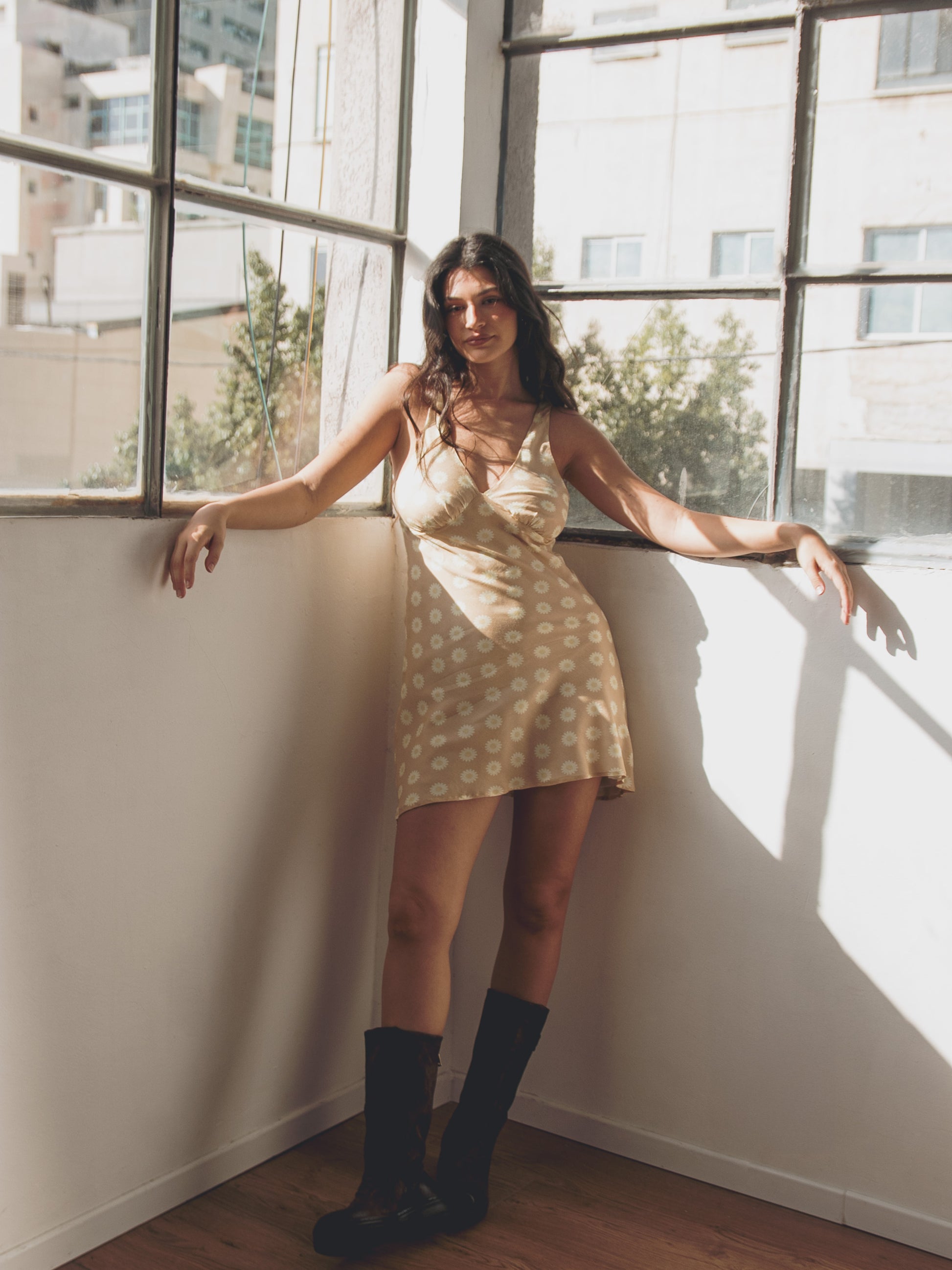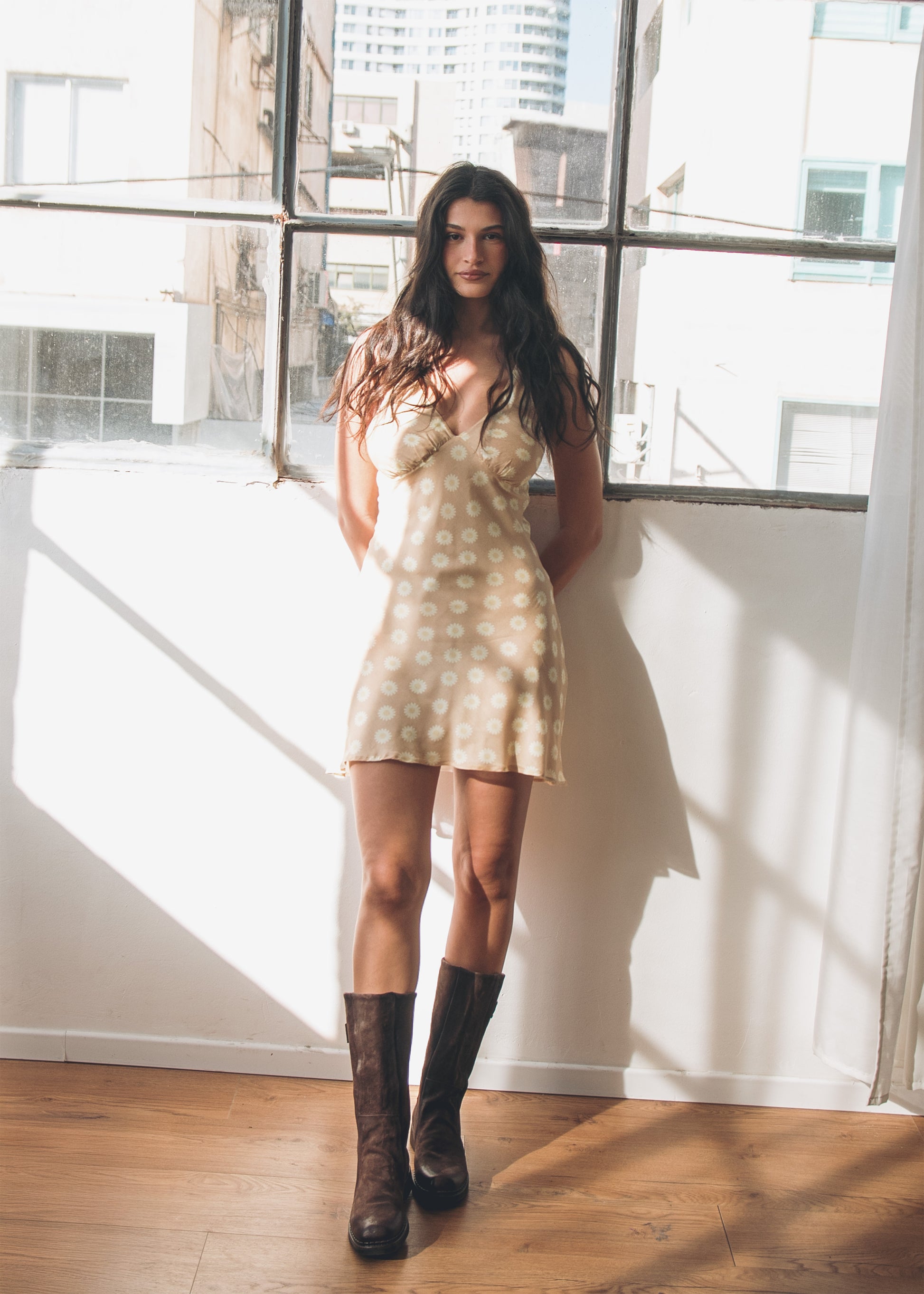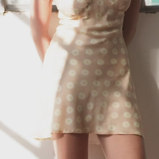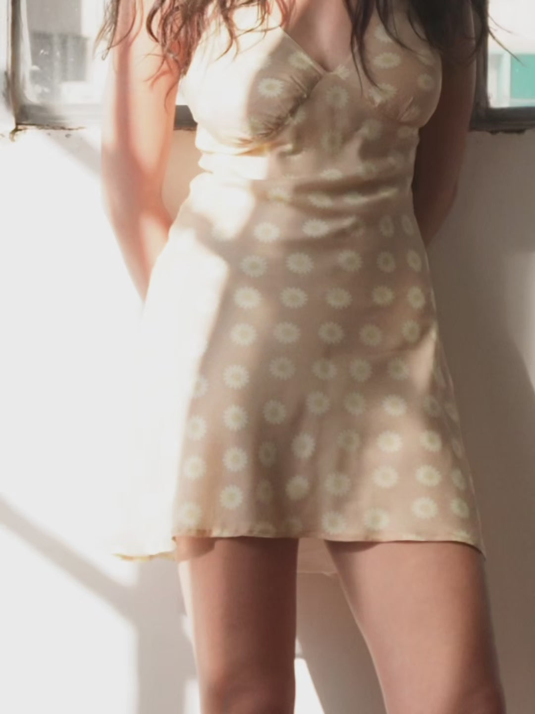 A lightweight cotton–silk voile dress with a soft sunflower print in a light tone.